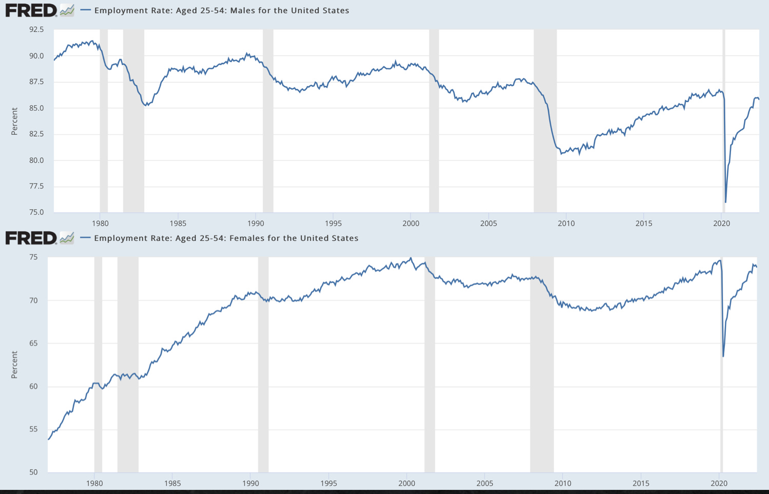 Although it is very alarming that for prime-age males, “full employment” is an employment-to-population ratio of 86%. What are the non-employed doing?
