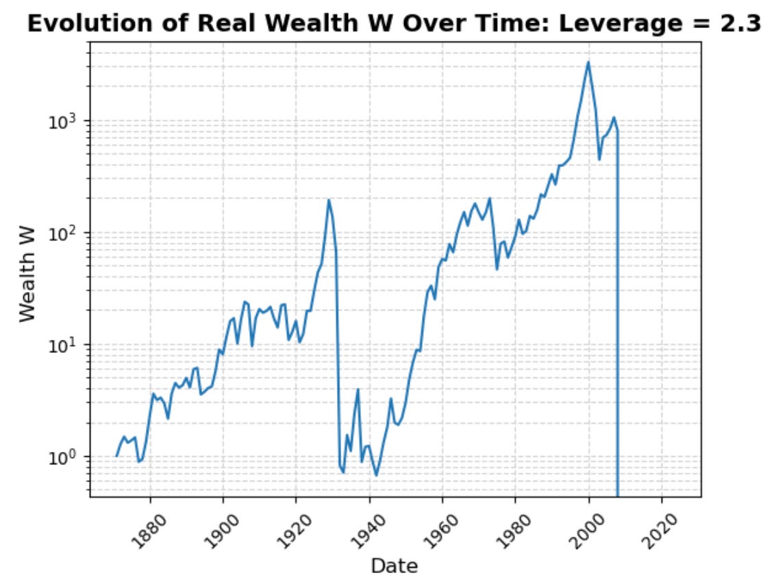 Indeed, if you choose a leverage factor of 2.3 you go spectacularly bankrupt in 2009.