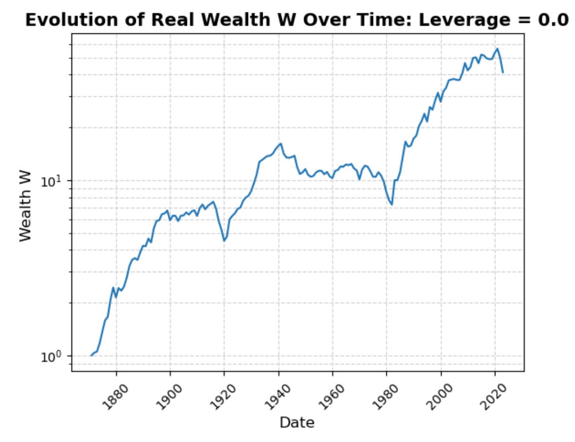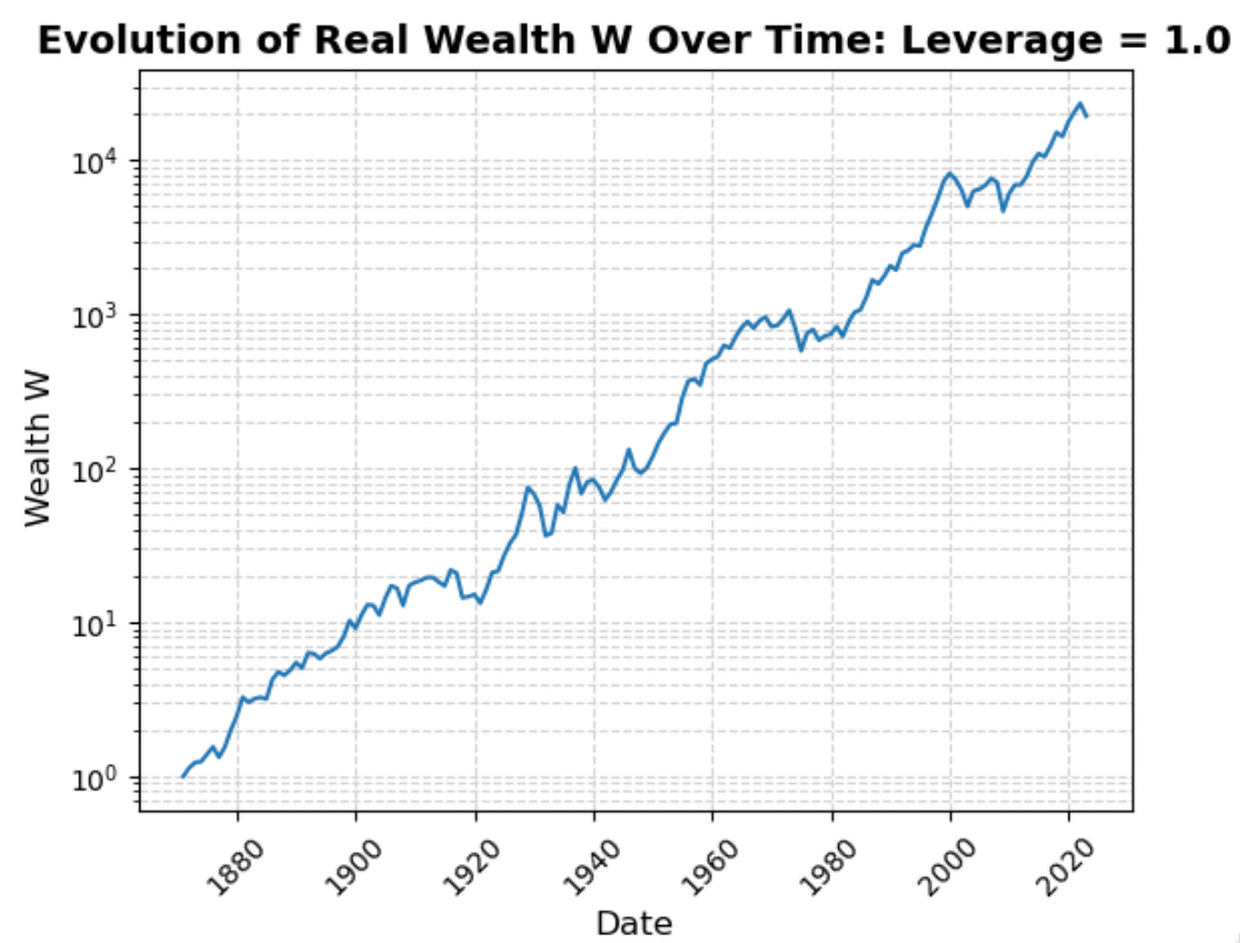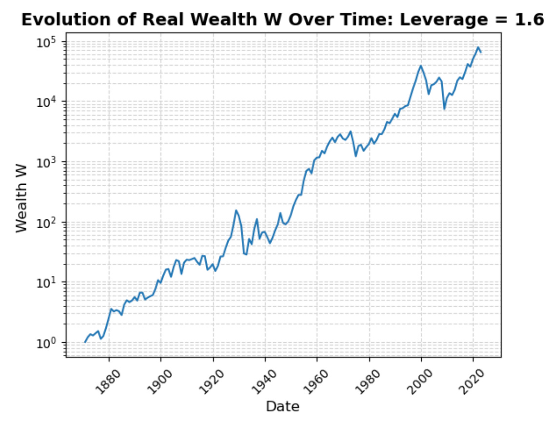 Optimal ex-post leverage is 1.6: that gets you a real continuously-compounded average geometric return from 1871 to 2023 of 7.291%/year, and a cumulative wealth-amplification factor across the century-and-a-half of 65004. (Compare to the zero-leverage all-bond portfolio annual real return of 2.448%/year and wealth-amplification factor of 41.)