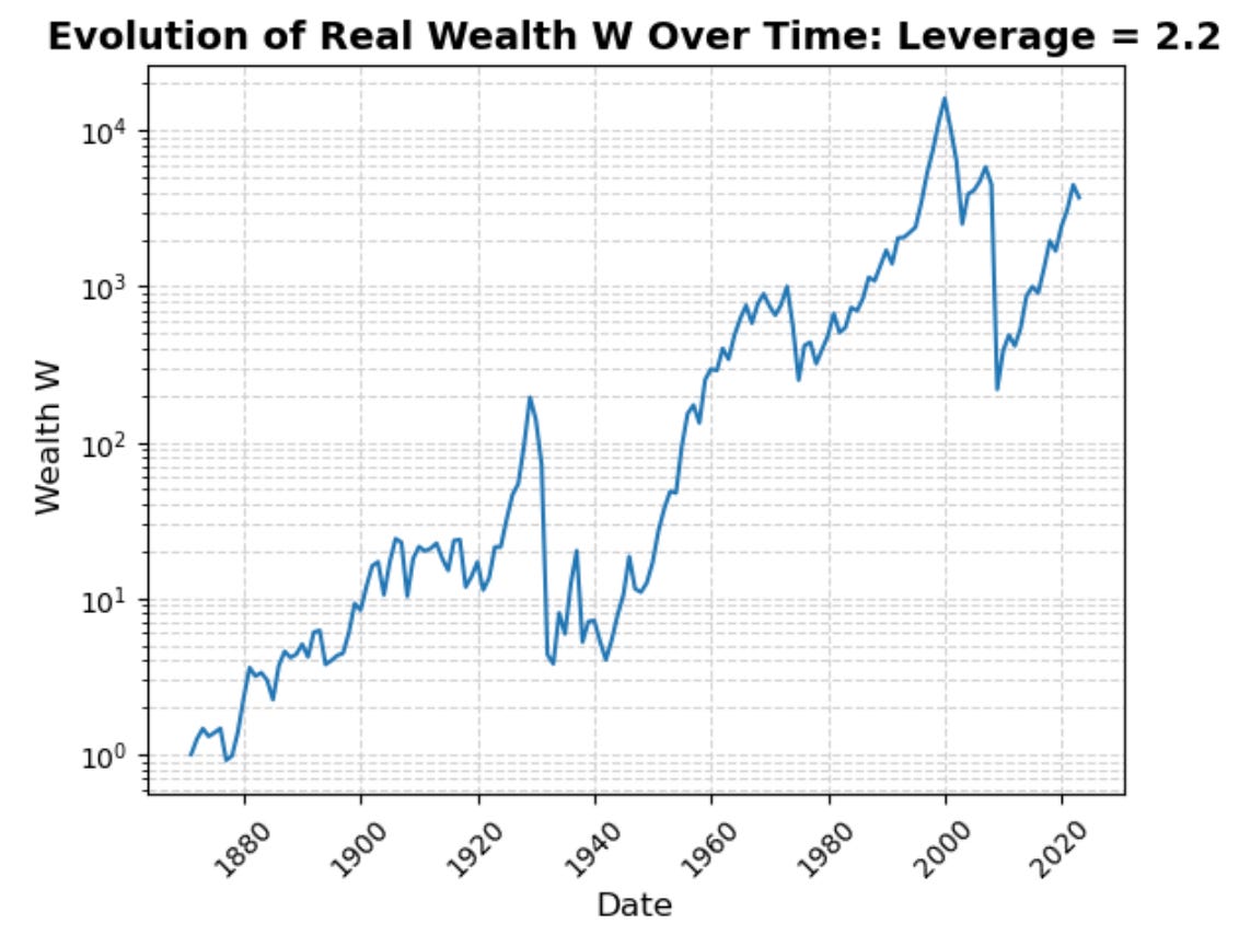 By contrast, raising your leverage to 2.2 sacrifices 1.8884%-points of annual return: it drops your average ex-post return to 5.407%/year and a cumulative wealth-amplification factor of 3708.