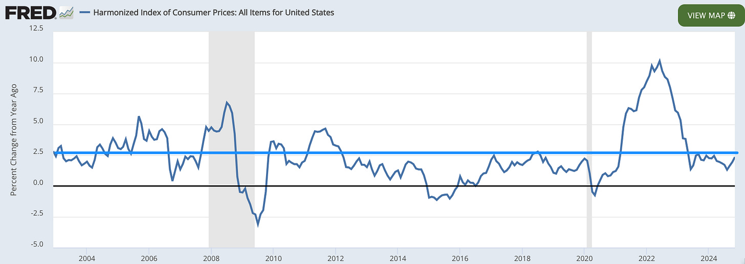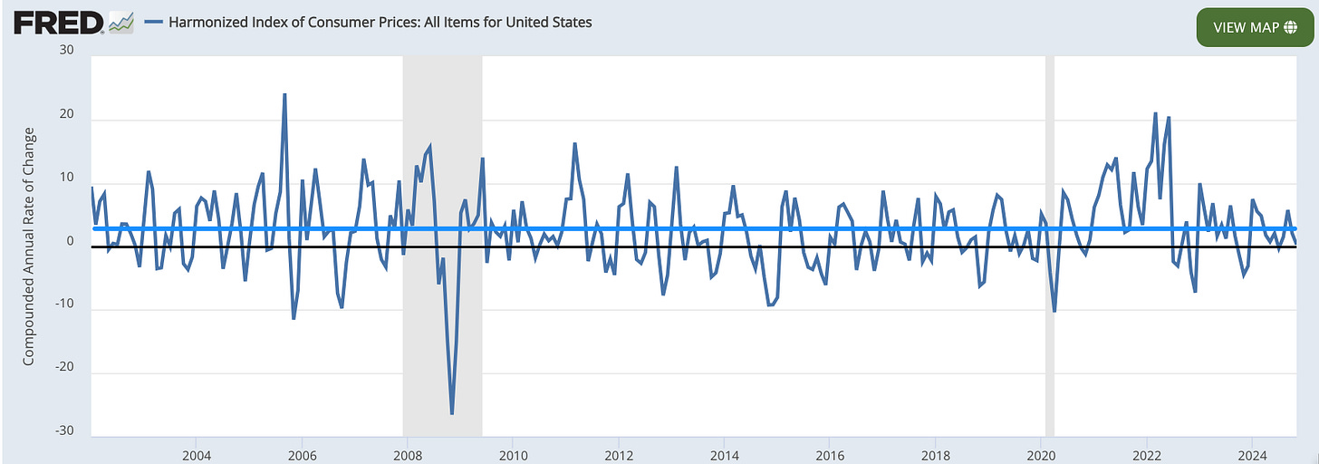 Since June of 2023 the trailing year’s average HICP inflation has been below the Federal Reserve’s 2%/year PCE & 2.5%/year CPI target. Since July of 2022 the month-to-month observed inflation has averaged less than the target. There never was a “last mile” get-inflation-to-2% problem. There was always only a “wonky CPI housing component” problem.