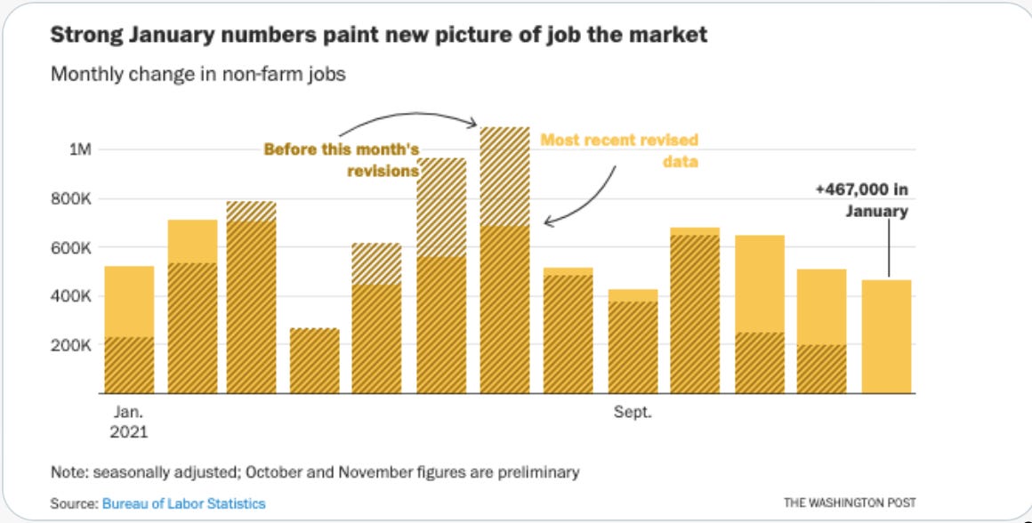 More (seasonally-adjusted) growth in employment than we had thought last winter and this late-fall and winter; less (seasonally-adjusted) growth in employment than we had thought last summer. And much more of an economy in which demand pressure ran into bottlenecks and showed up in rising prices rather than rising employment last summer than I had thought or than the numbers I was then seeing validated.