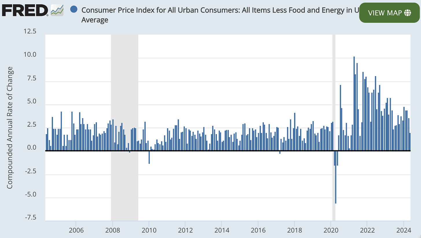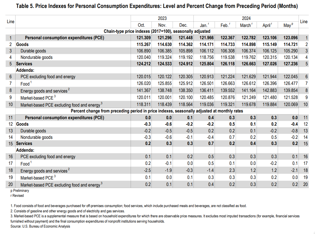 BEA: Personal Income and Outlays, May 2024: ‘The PCE price index decreased less than 0.1 percent [comparing May to April 2024]. Excluding food and energy, the PCE price index increased 0.1 percent (table 5). Real DPI increased 0.5 percent in May and real PCE increased 0.3 percent; goods increased 0.6 percent and services increased 0.1 percent (tables 3 and 4)… <https://www.bea.gov/sites/default/files/2024-06/pi0524.pdf>