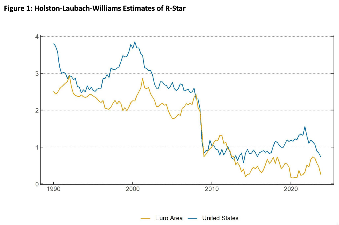 John C. Williams: R-star - a global perspective: ‘The case for a sizable increase in r-star has yet to meet two important tests. First… plausible factors pushing up r-star… are likely to be global… tension between the evidence from Europe that r-star is still very low and arguments in the United States…. Second, any increase in r-star must overcome the forces that have been pushing r-star down for decades… trends in global demographics and productivity growth…. HLW estimates of... trend potential GDP growth in 2023 are nearly unchanged from… 2019… <https://www.bis.org/review/r240703f.htm>