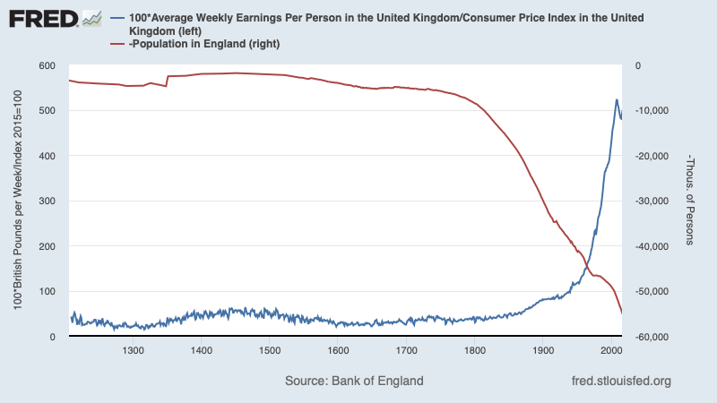 Fast forward to 1870, and real wages were no higher than they had been in the 15th century—but the population was much larger, so evidence of technological progress: