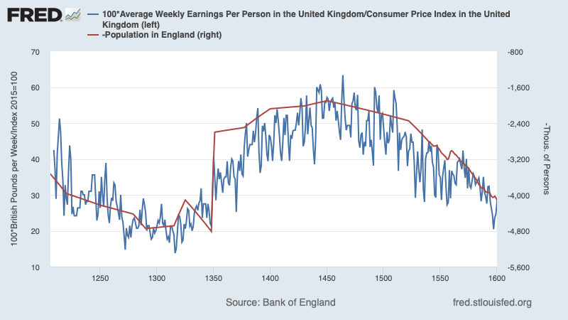 A few FRED-based thoughts on one of Brad's big insights: that the world didn't really break out of the Malthusian trap until 1870. As it happens, my friend FRED includes the Bank of England dataset with estimates of some UK variables going back to the Middle Ages. And it allows me to make a few pictures of real wages versus population.