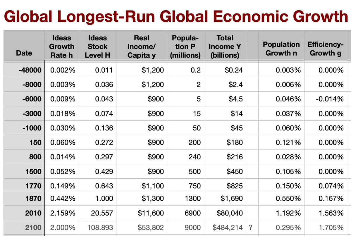 To which I replied: Suppose that you are willing to accept my heroic assumption that “technology” is proportional to average real income per capita times the square-root of population, and suppose that you are willing to accept our guesses about past population and my hard-Malthusian view of 1500 and before...