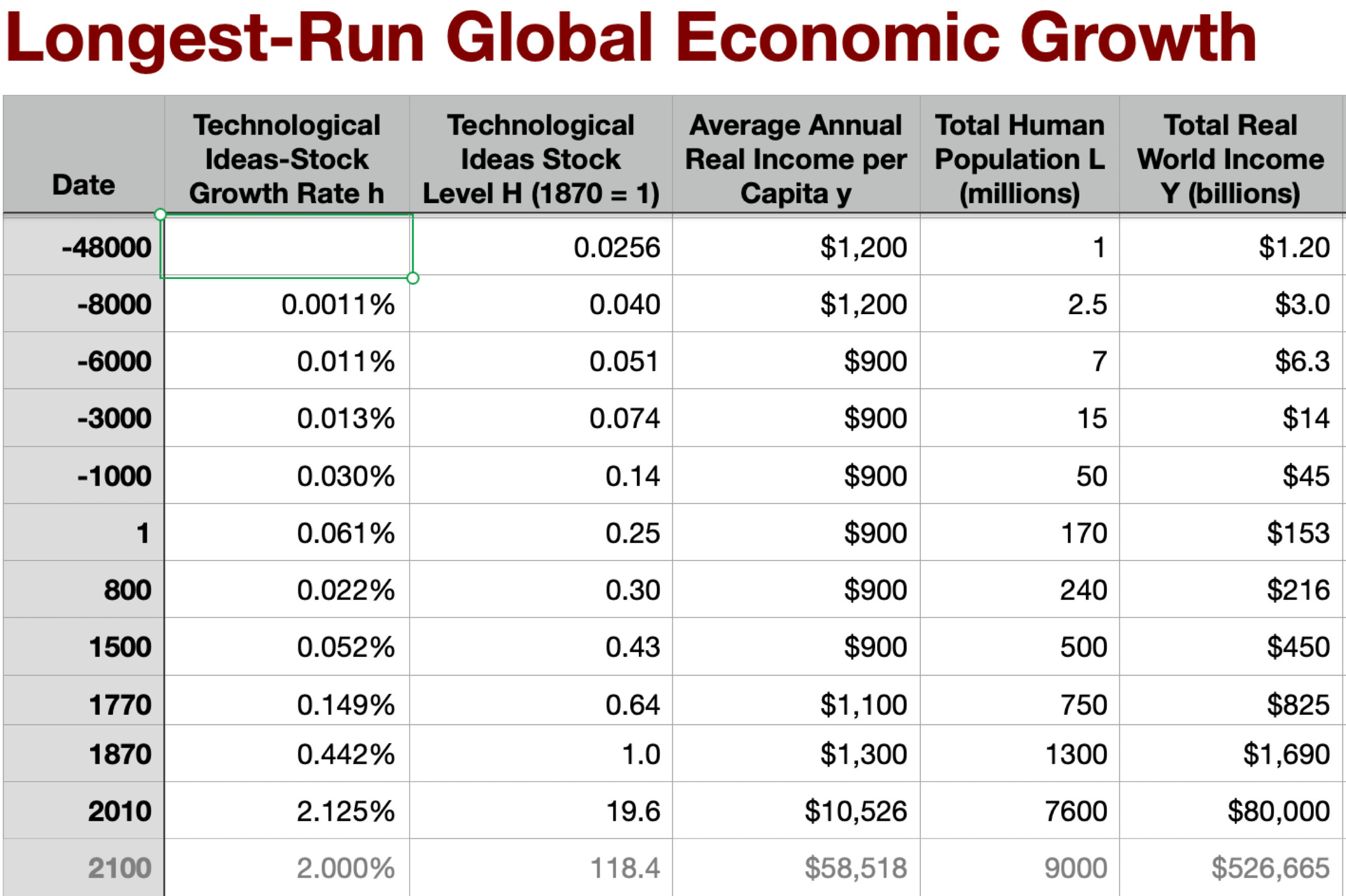 Why take the square-root? Well, if we just multiplied average income by population—called total world real income “technology”—we would be implicitly assuming that labor is useless and unproductive. But that cannot be right: each mouth comes with two eyes, two hands, and a brain. If we just took average income—called that “technology”—we would be implicitly assuming that natural resources are unimportant, and that it does not matter how small population growth has reduced the size of the average plot of land on which a typical person’s food is to be grown. That also cannot be right: resource scarcity, and attempts to compensate for it, are a very real thing in our world, today and in our past.