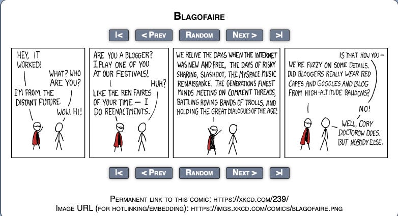 Cory: There’s this infamous and very funny old auto reply that Neal Stephenson used to send to people who emailed him. It basically went: “Ah, I get it. You feel like you were next to me when we were with Hero Protagonist in Alaska fighting off the right-wing militias. But while you were there with me, I wasn't there with you. And so I understand why you want to, like, sit around and talk about our old military campaigns. But I wasn't on that campaign with you.