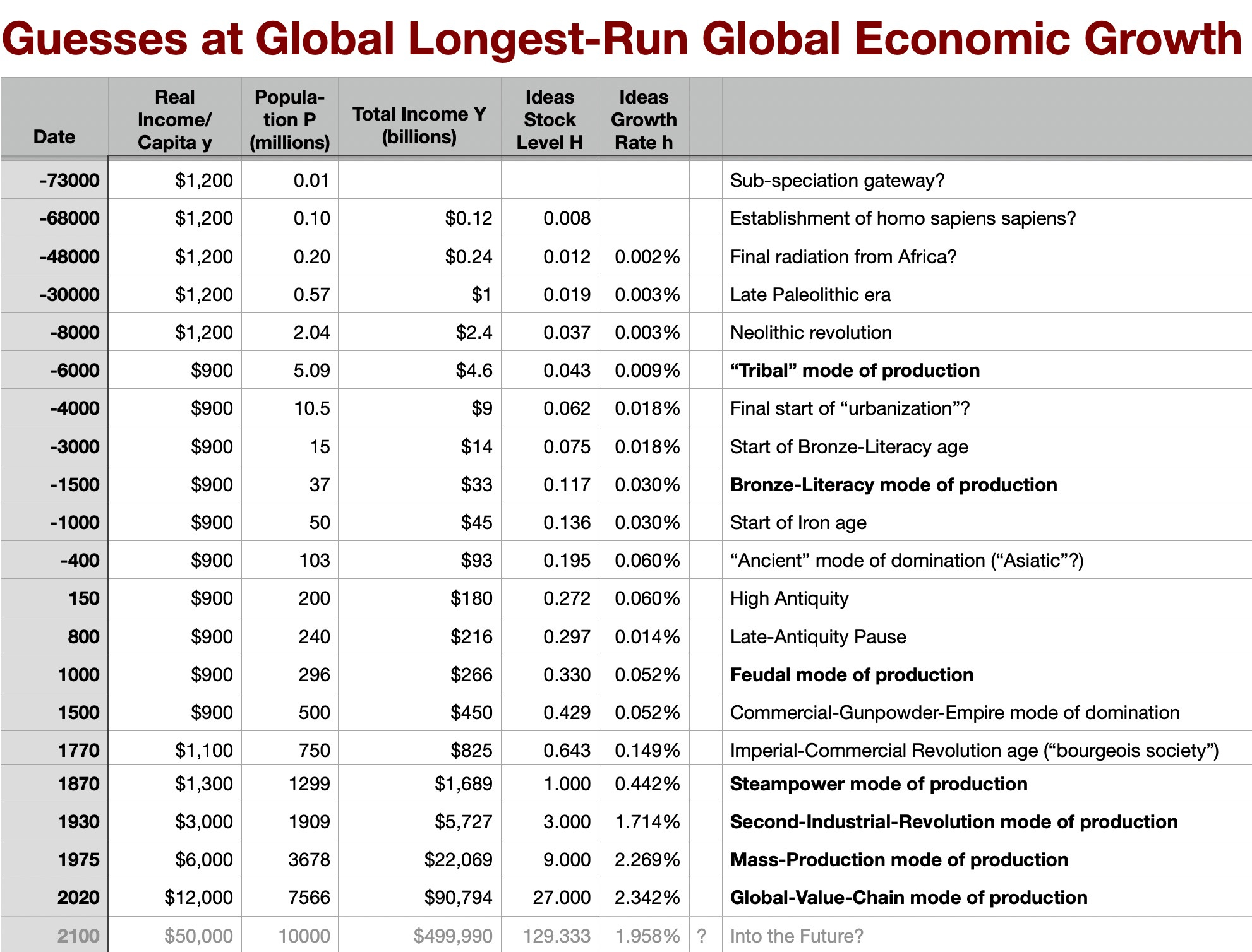 And throughout, I will structure what we do around this table of my guesses as to the shape of the human economy—how many people P, roughly what their average real income in today's dollars happens to be y, and then this measure of mine H, which is average real income times the square root of population which I will assert is a rough measure of human ideas about "technology": our capability to manipulate nature and productively organize ourselves. And population, average real income, and human ideas P, y, and H have their proportional annual growth rates n, g, and h, respectively: