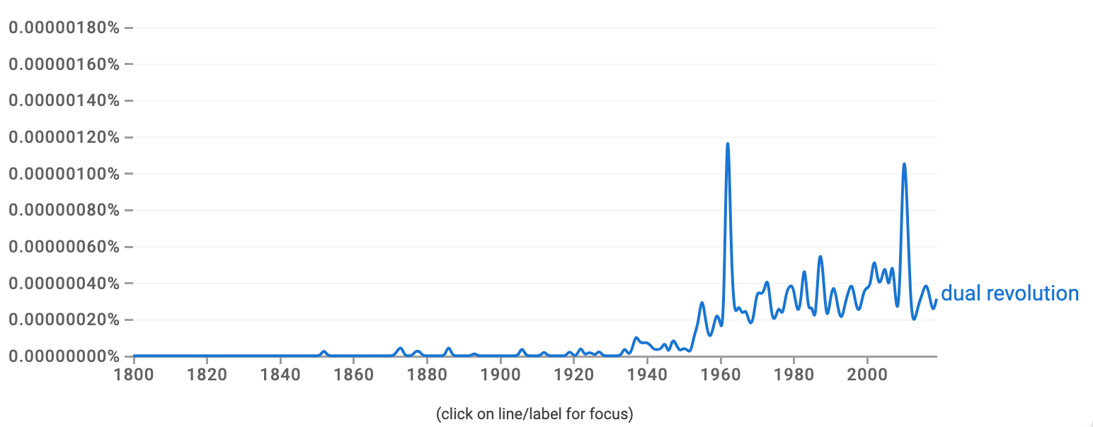 To my knowledge, the first person to use the phrase “dual revolution” in Hobsbawm’s sense was: