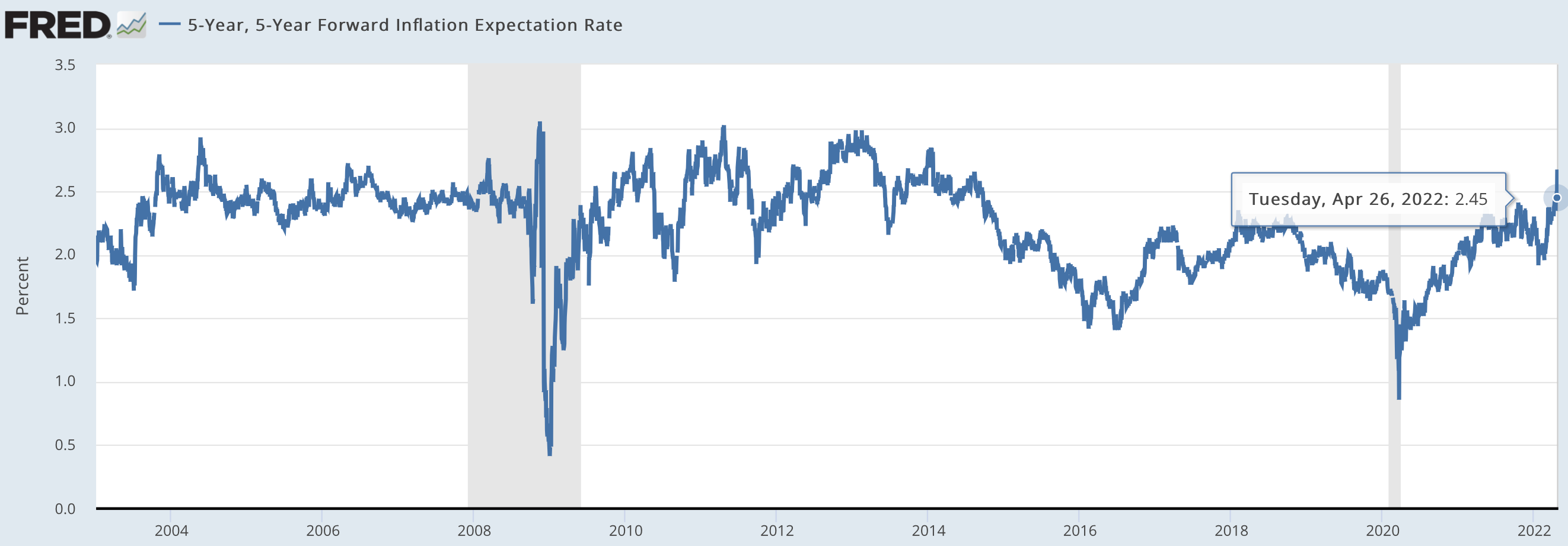 The five-year forward five-year CPI-inflation breakeven crossed 2.5%, but then retreated on Tuesday: