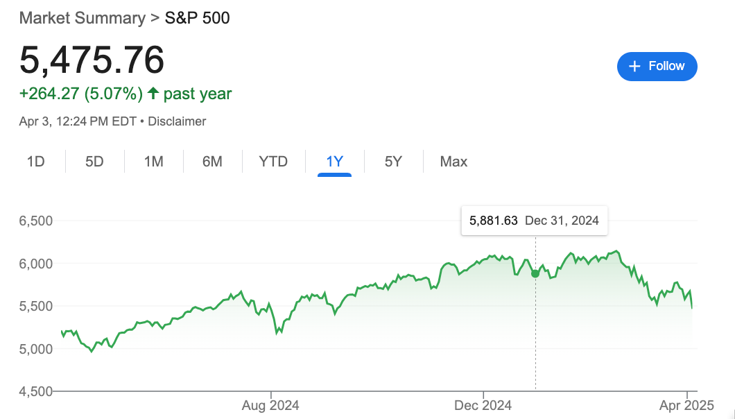 And yet S&P 500 stock market index is only—only—down 7% from where it was at the end of last year. I think the market is still expecting to wake up next week and recognize that this is all a dream, and that Scott Bessent is in control:
