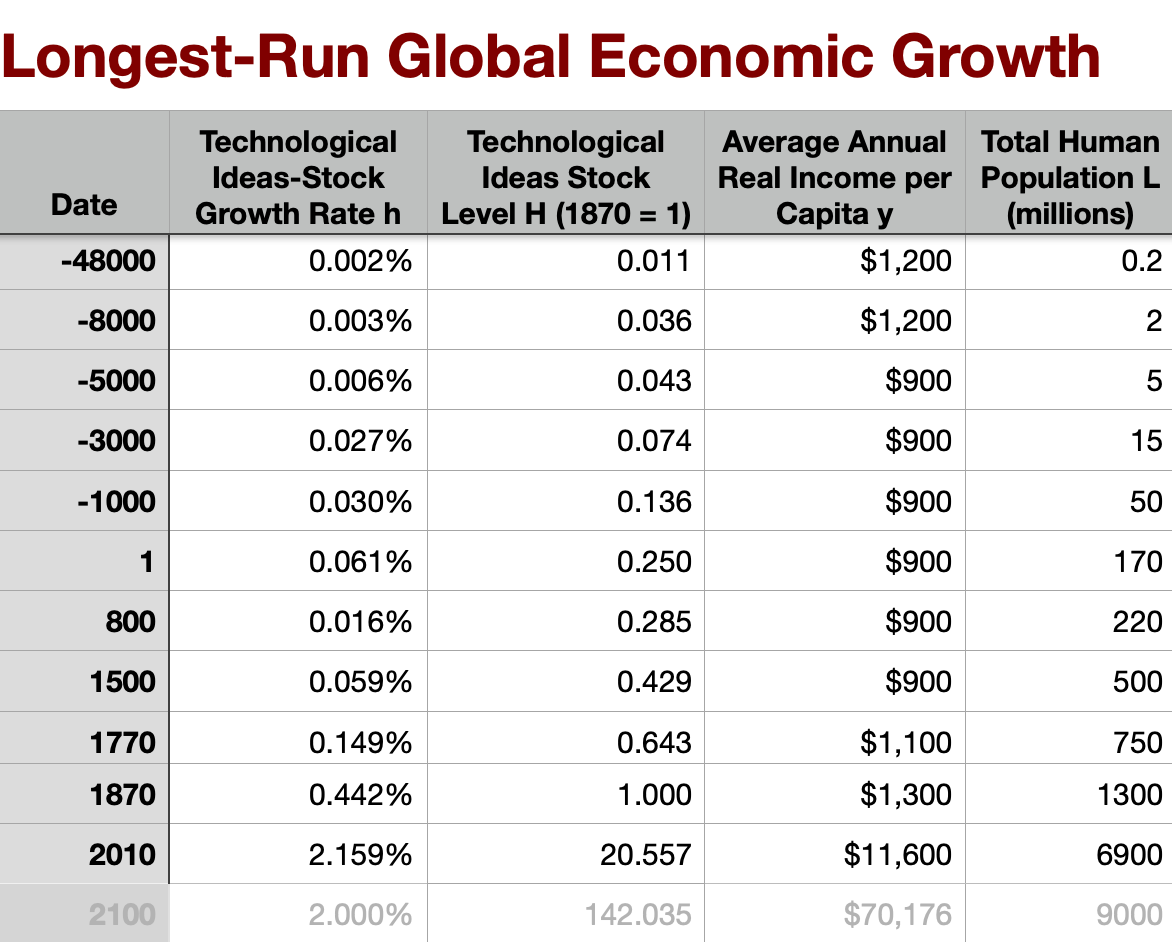 When we do this, we see that h has been 2.2%/year for a century and a half in our age of Modern Economic Growth; that it was less than a quarter as much—0.45%/year—for the Industrial Revolution Age century before that; that it was a third of that—0.15%/year—for the Imperial-Commercial Age from 1500-1770; that it was 2/5 of that—0.6%/year—for the High Mediæval Age from 800-1500; and that it was a quarter of that—0.015%/year—from the year 1 to the year 800. We see for the past 2000 years an upward march of the level of technology H—although for the first 1500 years this upward march is diverted to compensate for increasing resource scarcity as greater human numbers mean smaller farm and grazing-land sizes per person—at an increasing pace.