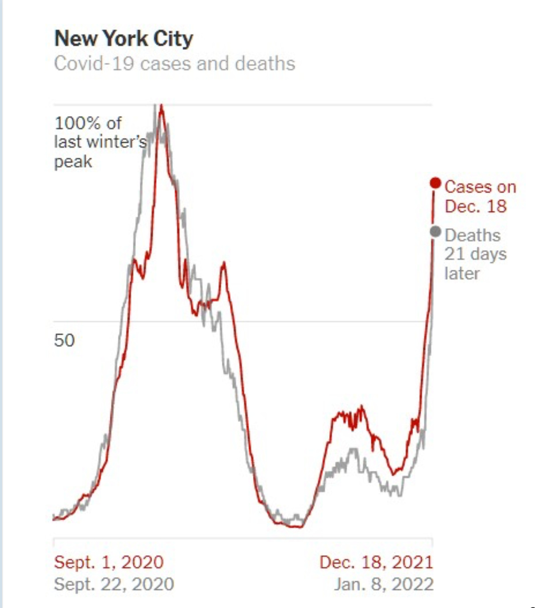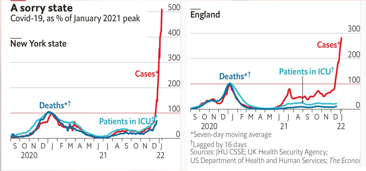 Last winter New York had no vaccines—all it had was acquired immunity from the spring and summer waves of plague. Now New York is 70% vaccinated, and, indeed, vaccination is doing a very good job of protecting people. But the 30% who are not vaccinated—they are the ones who are catching cases of the disease that are serious enough to get recorded in the system. And it looks like they are dying at the same rate that the unvaccinated population was dying last winter. If this is representative, it is not that Omicron is less virulent, it is, rather, that vaccinations work.