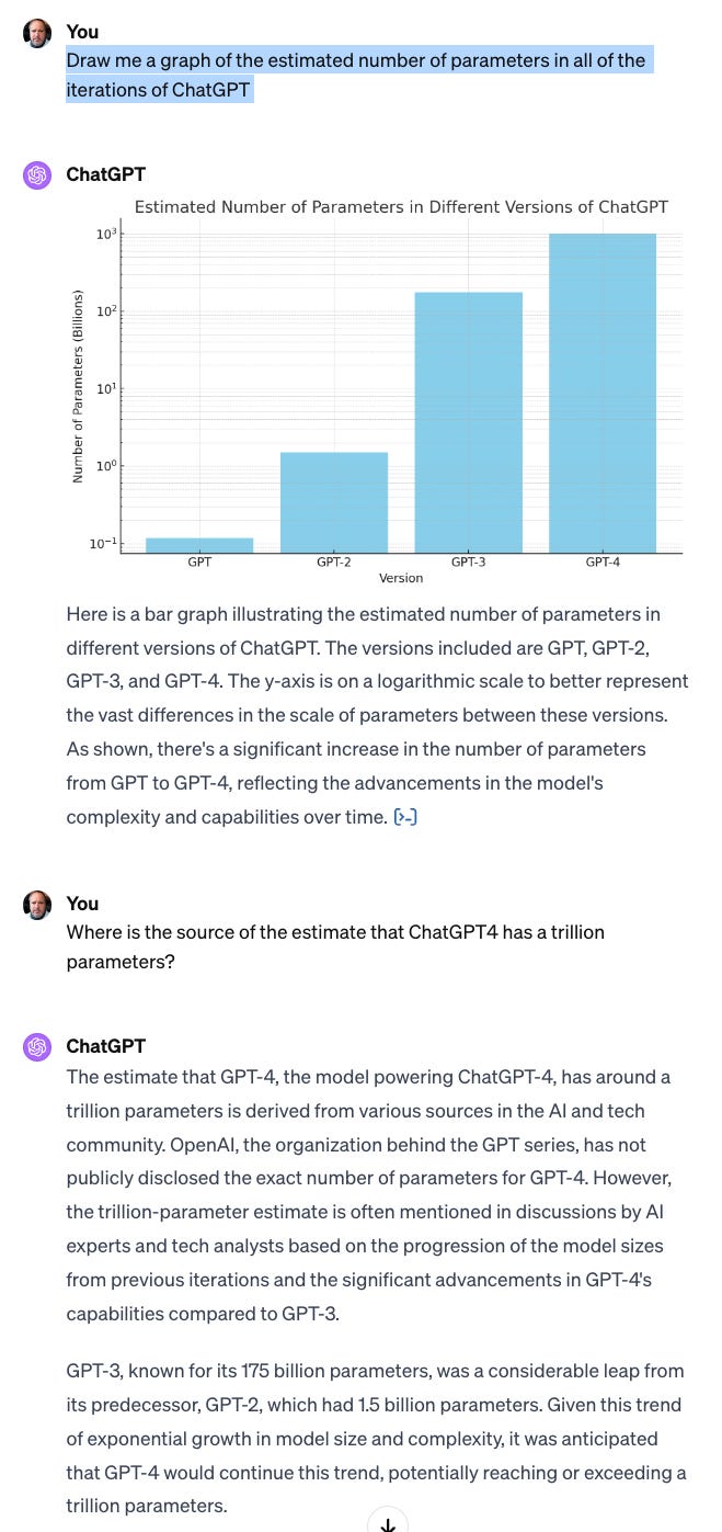 The current performance of LLMs is due to remedying these two defects. So far, my experience with co-piloting is underwhelming; they slow me down by nearly as much as they speed me up. Are improvements in the intelligence part of AI extrapolated from this sort of exponential graph? Training a very large LLM is already very expensive; will the next iteration be *exponentially* more expensive?