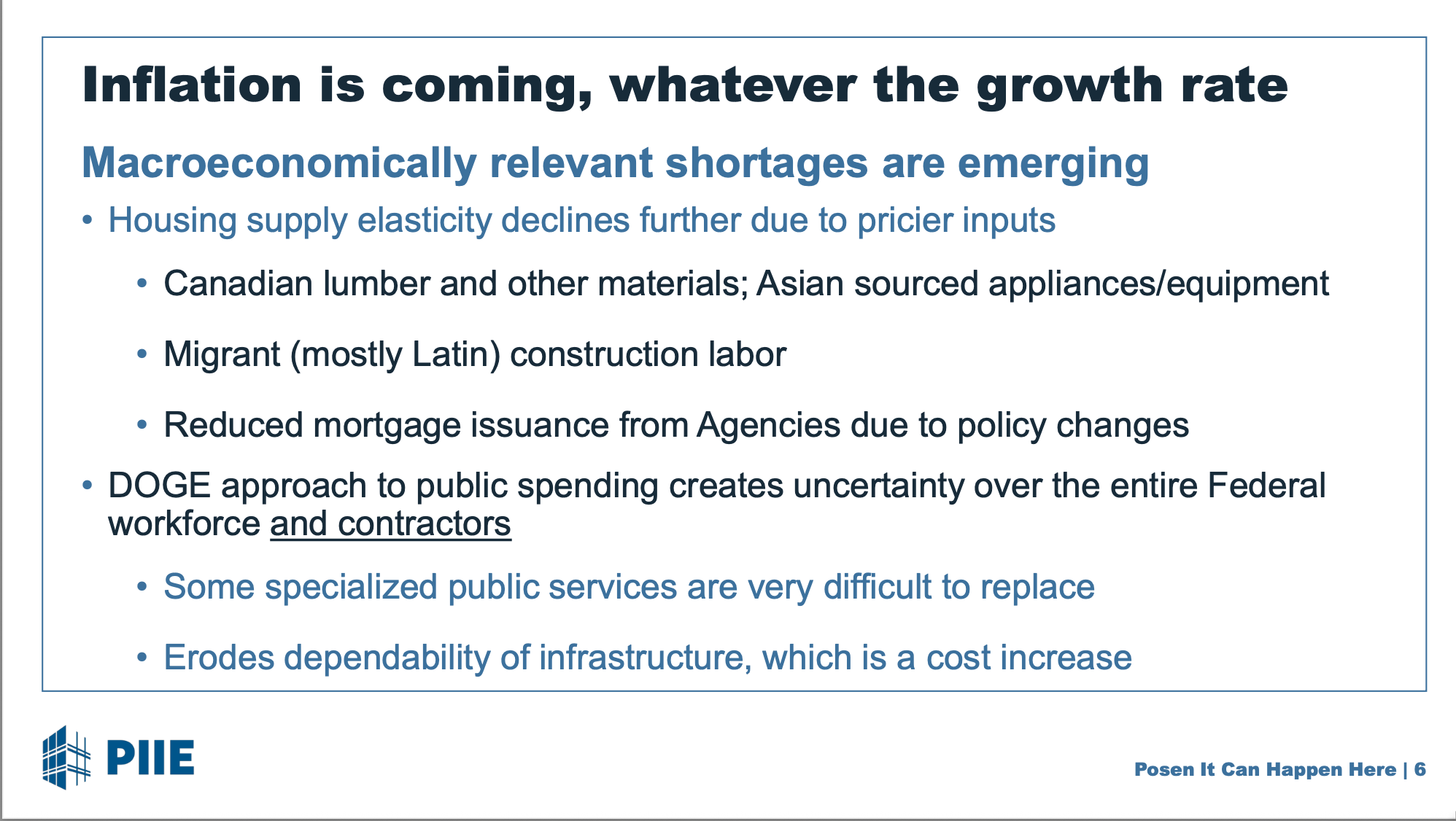 A sudden spike in tariffs has small businesses on the ropes, and the broader economy may be next. Yes, individually big businesses can lobby and bribe Trump and Trumpists for loopholes. But small businesses cannot, and they are going to be the things that are most macroeconomicly significant now. This likely recession will be a new kind of recession—not the result of inventory and investment cycles, supply shocks, bursting bubbles, or bank failures, but from brute idiot-policy force, a self-inflicted slowdown driven by tariff shocks and political brinkmanship. Since none of our models have been estimated on such a shock, it is a very brave forecaster who will put it out there right now. And so I am very grateful to Torsten Slok, Karen Dynan, and Adam Posen for doing so…
