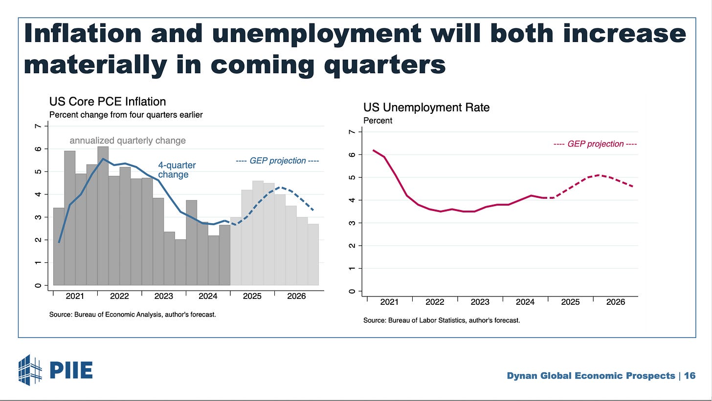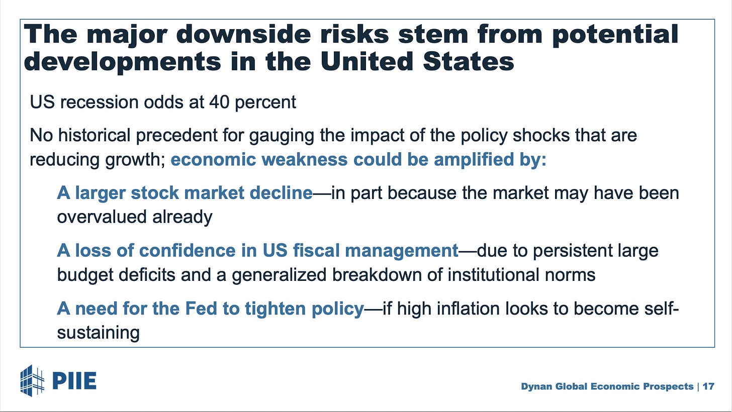 A sudden spike in tariffs has small businesses on the ropes, and the broader economy may be next. Yes, individually big businesses can lobby and bribe Trump and Trumpists for loopholes. But small businesses cannot, and they are going to be the things that are most macroeconomicly significant now. This likely recession will be a new kind of recession—not the result of inventory and investment cycles, supply shocks, bursting bubbles, or bank failures, but from brute idiot-policy force, a self-inflicted slowdown driven by tariff shocks and political brinkmanship. Since none of our models have been estimated on such a shock, it is a very brave forecaster who will put it out there right now. And so I am very grateful to Torsten Slok, Karen Dynan, and Adam Posen for doing so…