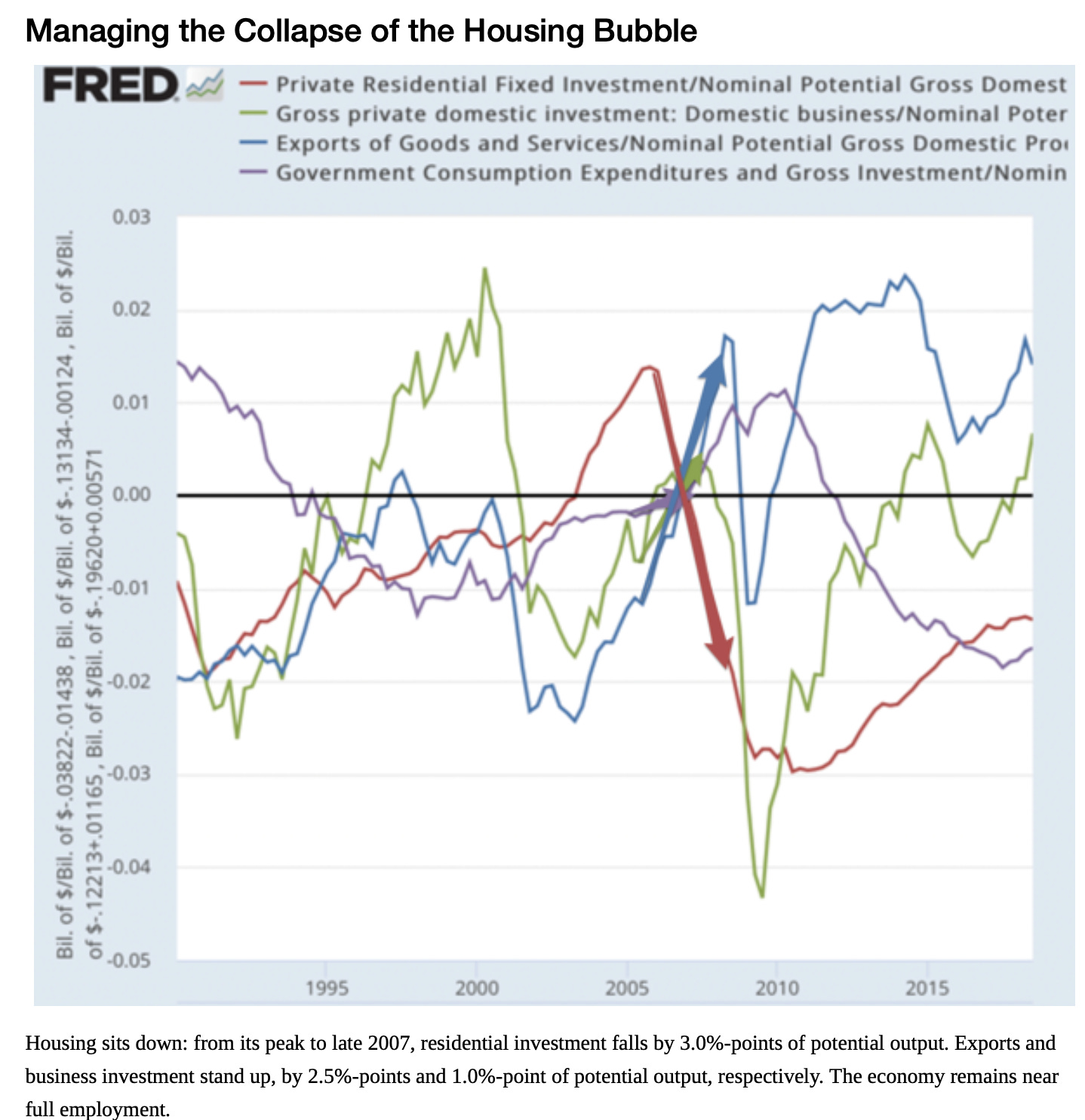For one thing, he was then under the false illusion that housing construction was then in some sense above trend, and we needed to shift labor out of construction to rebalance the economy. The structural adjustment had already been carried out over the previous 2 1/2 years, as construction spending had stood down and domestic consumer and equipment manufacturing had stood up, and has labor had flowed out of construction and into other sectors: