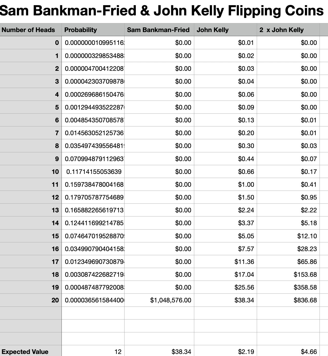 After 20 bets, Sam Bankman-Fried is bankrupt 99.9963% of the time. But 0.0037% of the time he has $1,048,576,000. But his expected value is $38,340—19 million mosquito nets. 99.9963% of the time Sam Bankman-Fried has lost his dollar, and bought none of the mosquito nets he wanted to buy and distribute. But that 99.9963% of the time Sam Bankman-Fried consoles himself by thinking that somewhere out in the quantum superposition that is the multiverse is the version of him that got lucky and managed to buy and distribute 524,288,000 mosquito nets. And, if he is a good follower of the Everett interpretation of quantum mechanics, that makes Sam Bankman-Fried happy ex post. And there is the 0.0037% of the time that Sam Bankman Fried does manage to buy and distribute 524,288,000 mosquito nets,