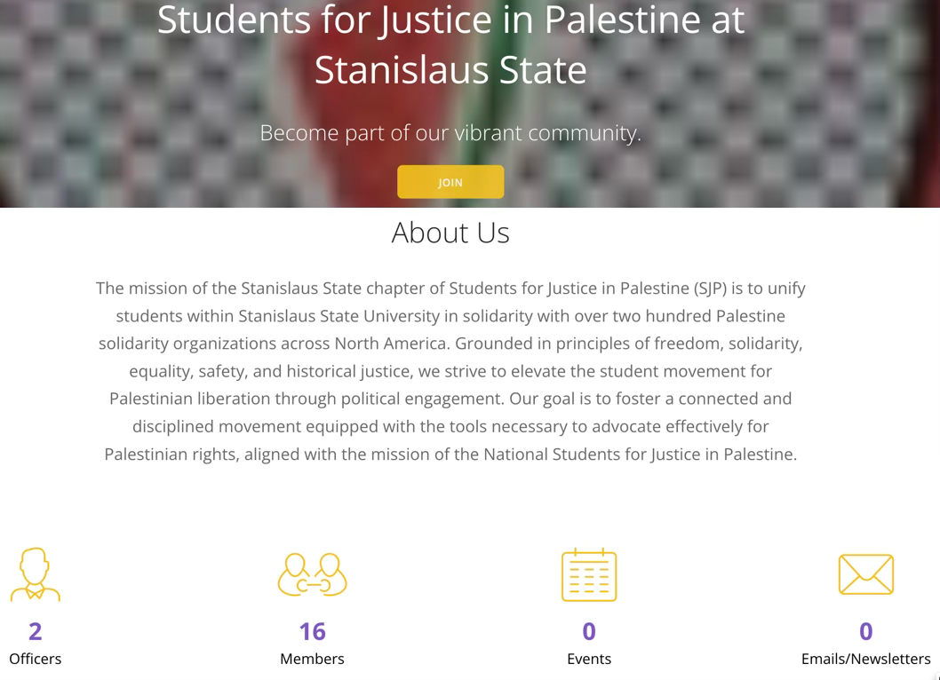 So I drop over to google, search for “National Students for Justice in Palestine”, drop down to the bottom of the first results page, click the link, and find myself at: <https://warriorlife.csustan.edu/sjp/home/>: