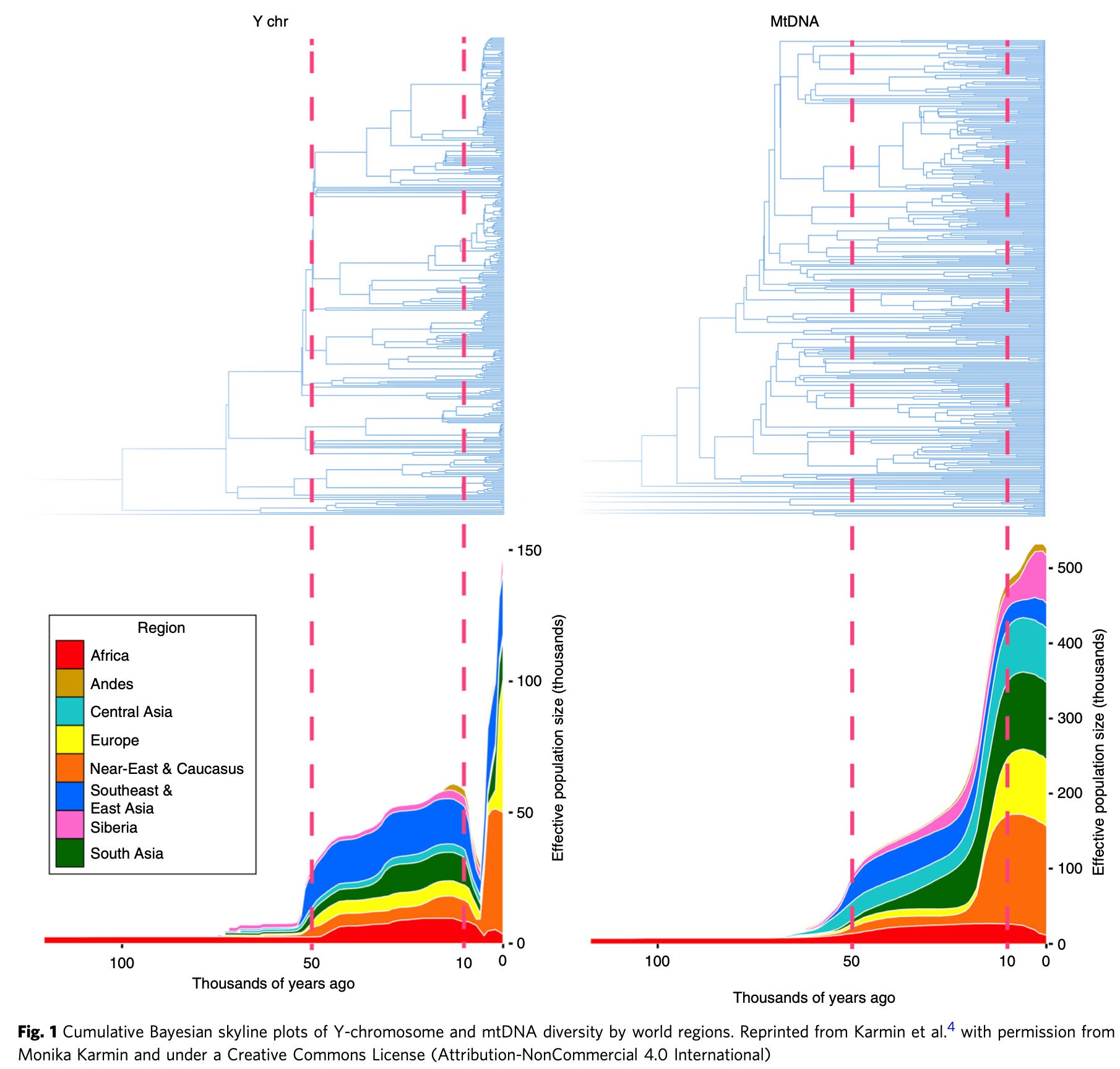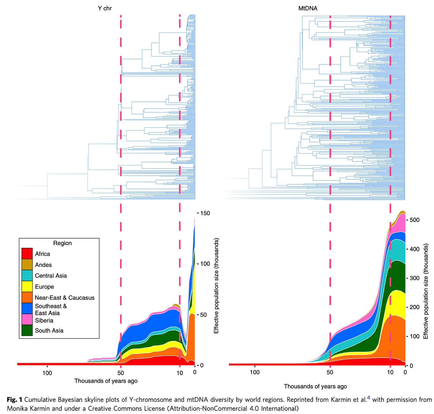 The mitochrondrial-y-chromosome DNA pattern is a thing: over the past 100,000 years or so, effective male population sizes 1/3 of effective female population sizes, with this enormous relative depression in the effective male population size down to 1/20 of the female population size centered around 5000 years ago. Over our entire recent, history, y-chromosome variant lineages are not emerging as fast as they should if as many males are breeding as females—suggesting moderate polygyny. And things go totally haywire in the period centered on 5000 years ago. Or so we think: