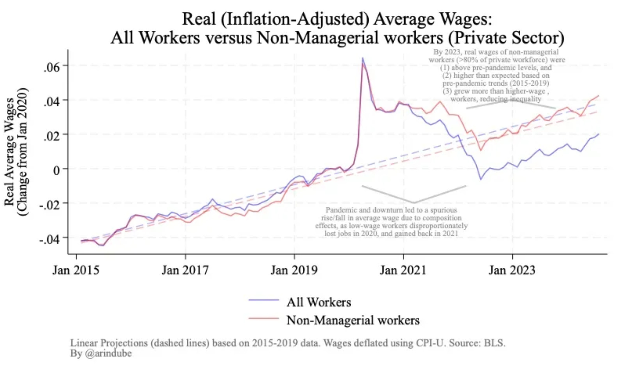 Figure that managers are 10% of the workforce and 20% of the wage bill. That means that your typical manager saw their real income fall by 10% as a result of the plague disruption and subsequent wheeling of the labor market into its new configuration, while non-managerial real wages have kept growing along their pre-plague track: