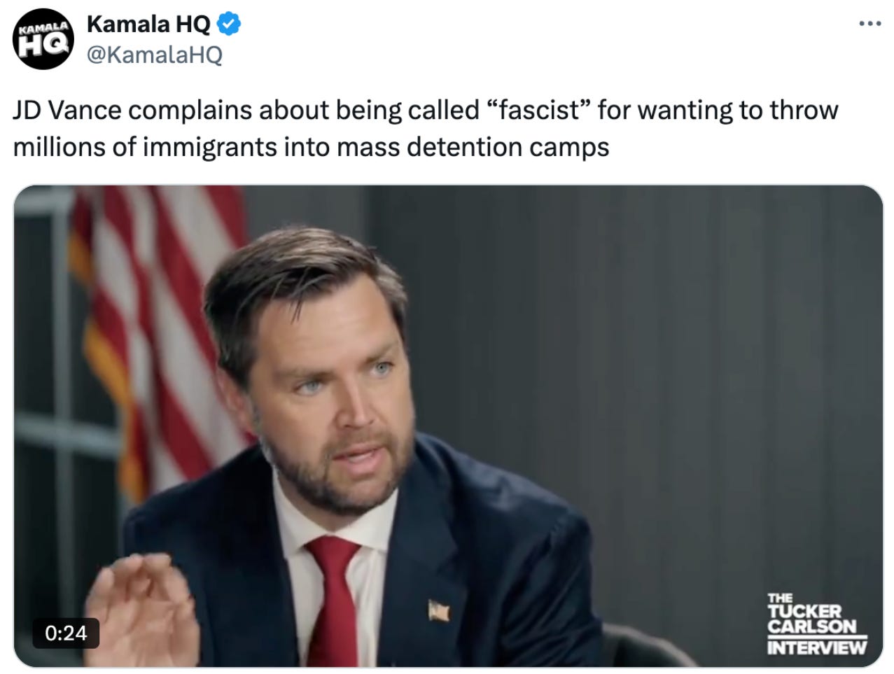 It is the expressed policy of the Trump campaign that a renewed Trump administration would arrest, imprison, and deport 20 million people from the United States, is it not? And there is no point for Trumpists to say they are only after “illegals”. They are not—they are especially after legal residents of Springfield, Ohio who have fled here from Haiti. If you are Slovenian-American or Czech-American, you are probably OK. (But I wouldn’t place bets if you are Ukrainian-American.) And if you are Indian-American, I would watch out: