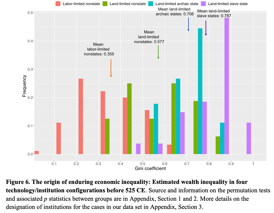 Sam and Mattia (and Amy Bogaard) argue that this shift not only plausibly raises the importance of shocks and the persistence of wealth differences via inheritance but also plausibly leads to shifts in culture and in what economists these days call “institutions”. From Bogaard, Fochesato, and Bowles (2019):