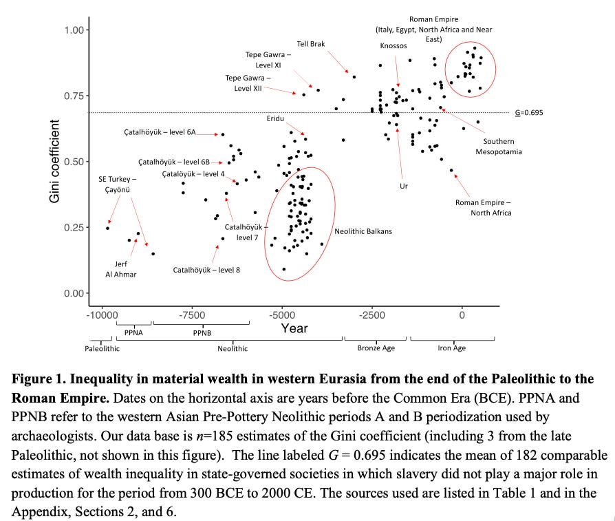 We have documented a shift from what appear to have been cases of episodic and rare elevated levels of wealth inequality in the Late Paleolithic and Early Neolithic… to sustained high levels of wealth inequality in the Bronze and Iron Ages…. A closing conjecture. The increase in material wealth inequality associated with the transition from a labor-limited hoe-based farming to a land-limited plow agriculture might have also proved to be ephemeral had it not been for the Bronze-Age concentration of coercive power… [in] the emerging economic elite. The changes in both farming technology and political organization may have been jointly necessary and sufficient to explain the origin of enduring wealth inequality…
