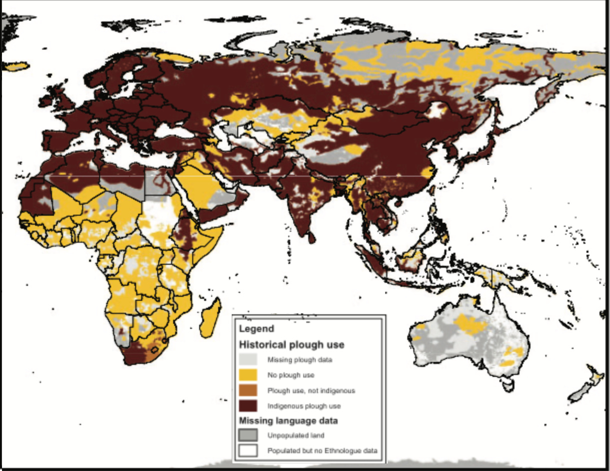 Second, attempts at empirical testing run into the problem that the geography of the Old World as far as plough vs. hoe is concerned prohibits you from saying anything with certainty more than plough-ness or plough-suitability is at least a plausible marker of important processes of diffusion of some sort. The plough spreads where there is sufficient soil, sufficient water, and a sufficient absence of intense animal parasites—but that spread is largely the same as the spread of all kinds of other features of human society via migration, trade, and contact as well.