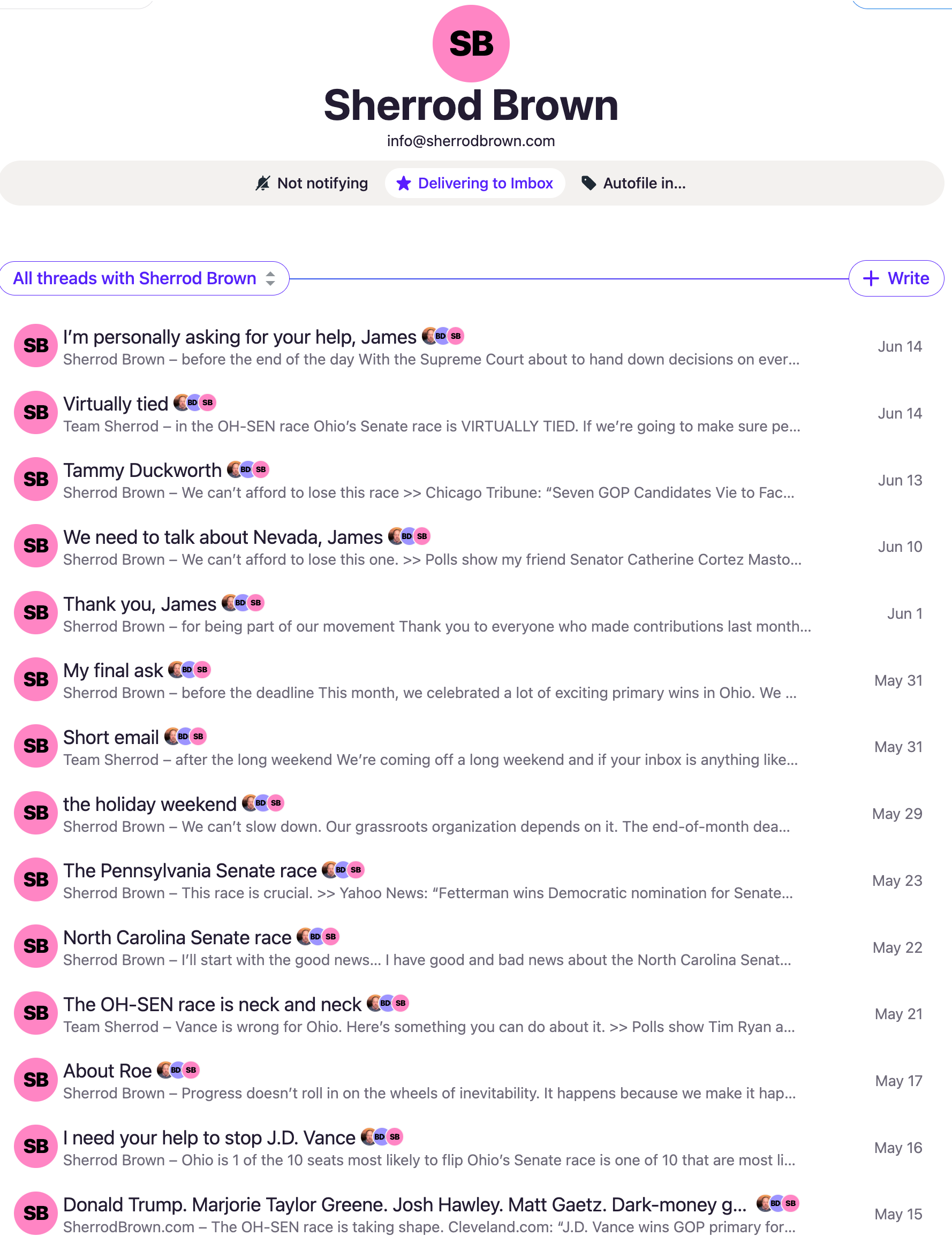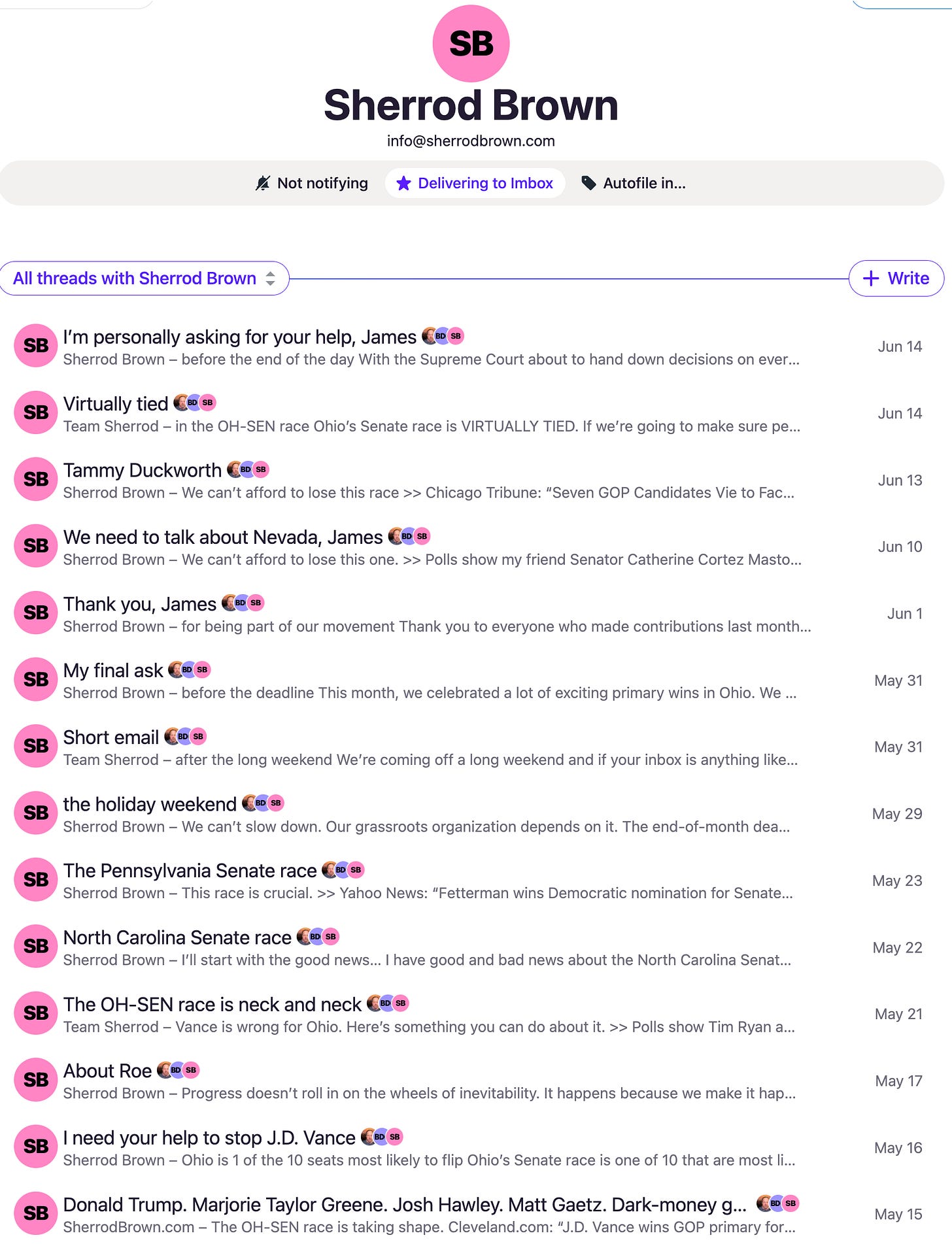 A fundraising email—and I screen all of these out. But there is one set I don’t: once I missed an email from the excellent Ohio Senator Sherrod Brown because I had screened out @sherrodbrown.com (and if my brother had not warned me that the excellent Colorado Senator Michael Bennet was looking to talk to me, I would have missed one from him as well. But what does Sherrod Brown send me? This:
