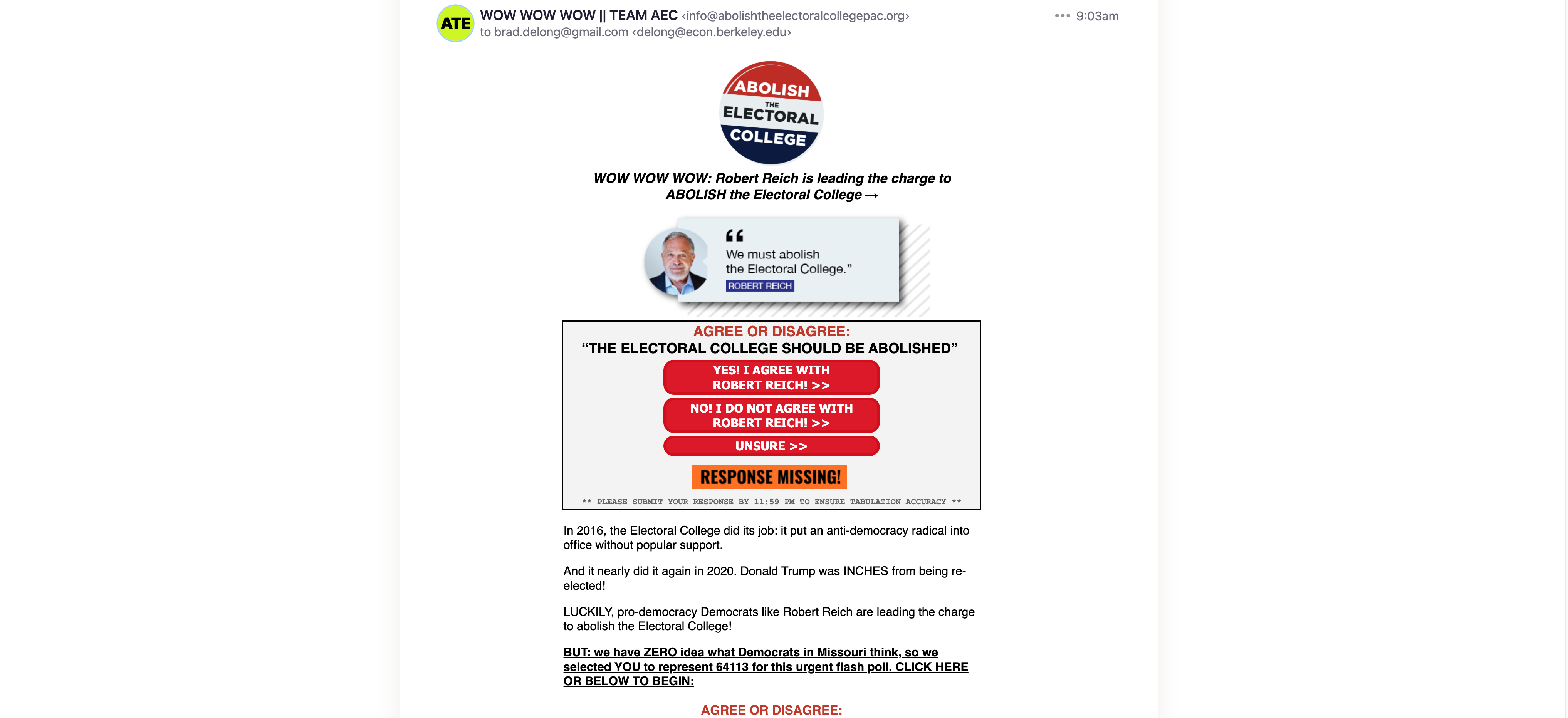 A weekly email to me without even an implicit money ask, but with (a) a real set of poll questions; (b) an open-ended ask for what’s worrying me; (c) if I do write in the “worrying me” box, a personal response from my block or precinct or local or affinity party branch head teling me my concerns are being pushed up the chain; and (d) wild dreams for what we hope we will be able to do after the next election plus (e) realistic assessments of what we will be able to do before the next election—that is what would make me feel much more connected. Follow that with a monthly fund-raising email, and I would be a much more contented money-cow that would be more easily and effectively milked.
