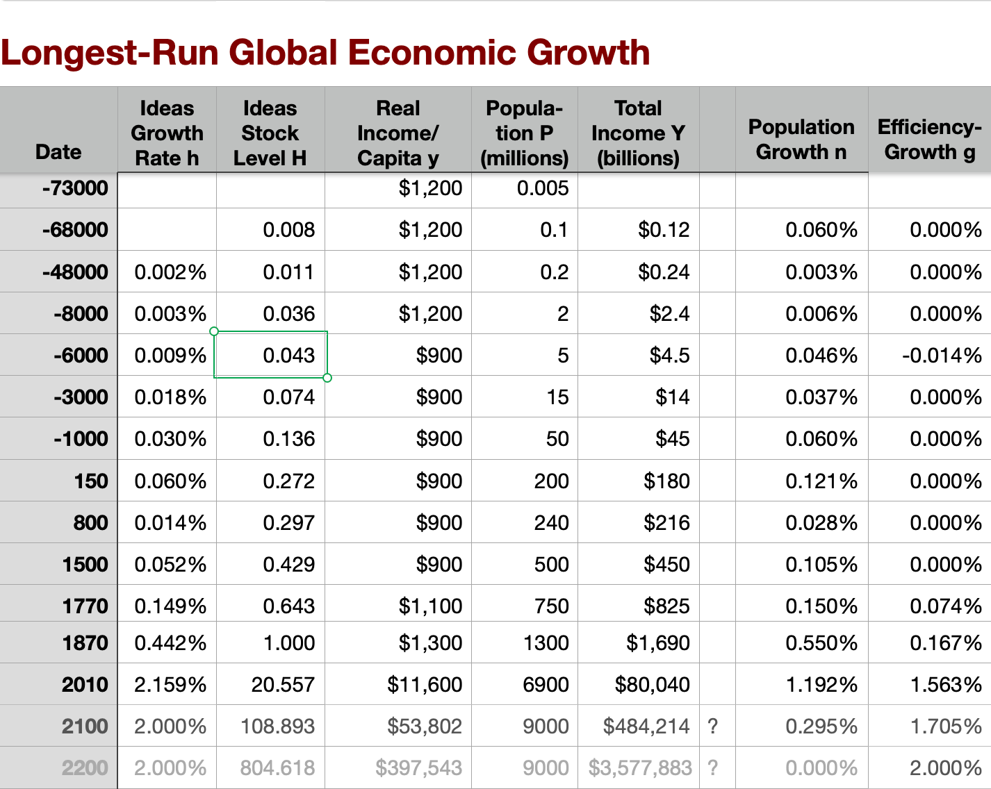 It is also true that what one worker could do in 1870 required 20 in -6000. But that 20-fold amplification was an 8000-year creep rather than a 140-year sprint: a proportional growth rate of 0.04%/year rather than 2.1%/year. And from -6000 to 1870 the overwhelming bulk of the potential benefits for humans from that twentyfold upward creep of technological knowledge had been eaten up by growing resource scarcity: the land and other natural resources available to support 1 person in -6000 had to support 400 by 1870.