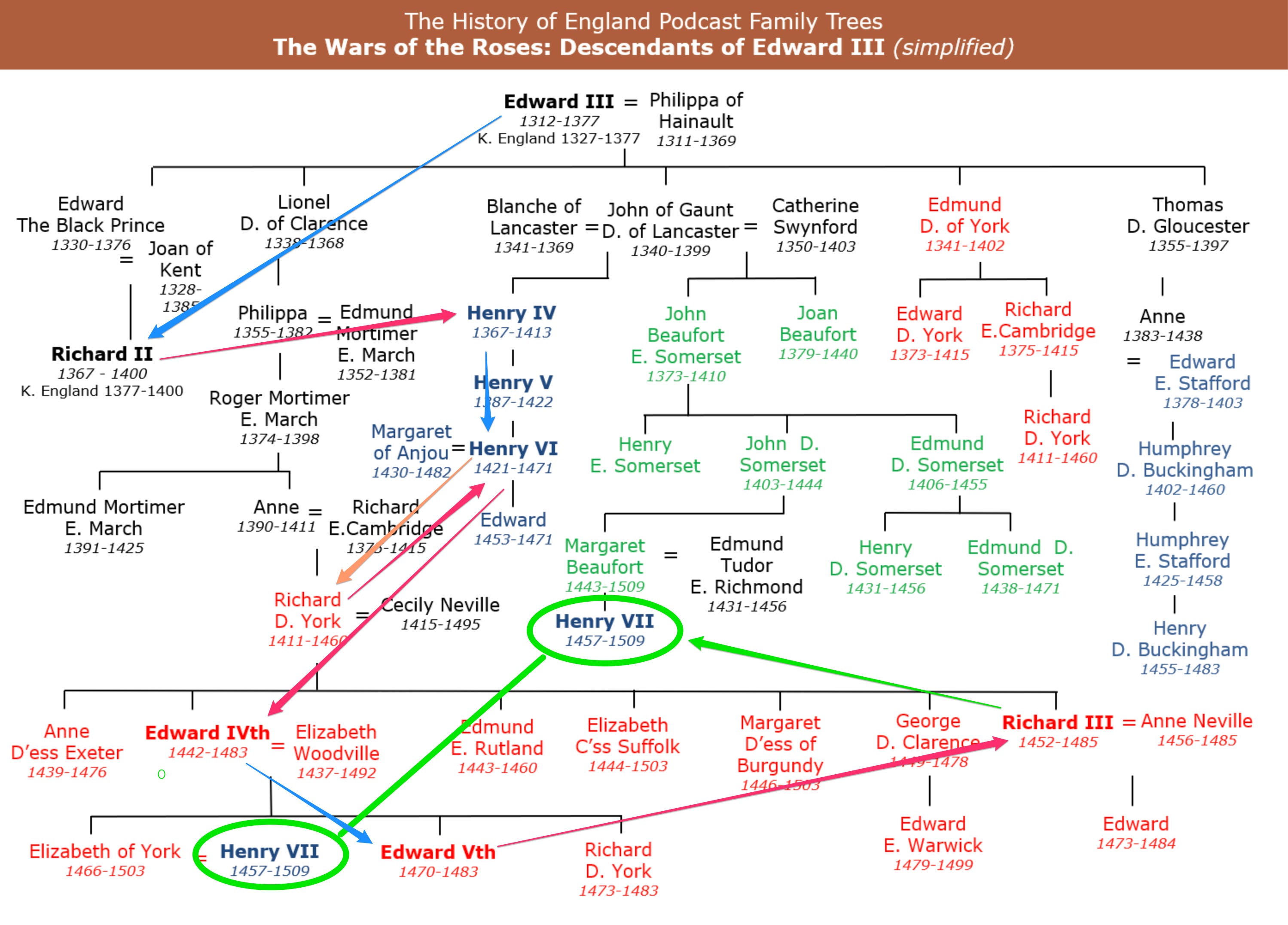 Blue lines are lines of “legitimate” succession. I have included Richard Duke of York because he was, briefly, a regent of a sort. And Henry VII Tudor appears in two places—as the son of Margaret Beaufort and Edmund Tudor Earl of Richmond, and as the spouse of Elizabeth of York.